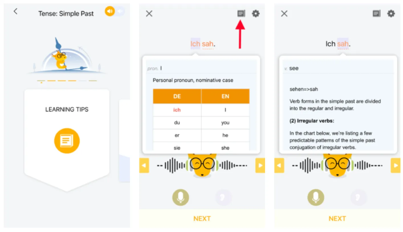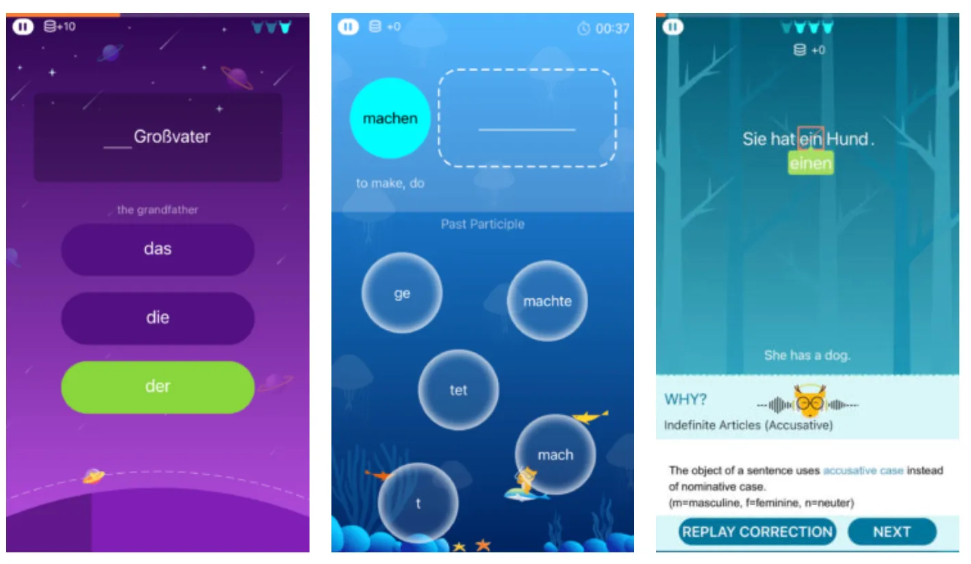 The German language demands accurate grammar, such as use of articles and verb conjugations. You can practice grammar using a variety of fun games in the app.